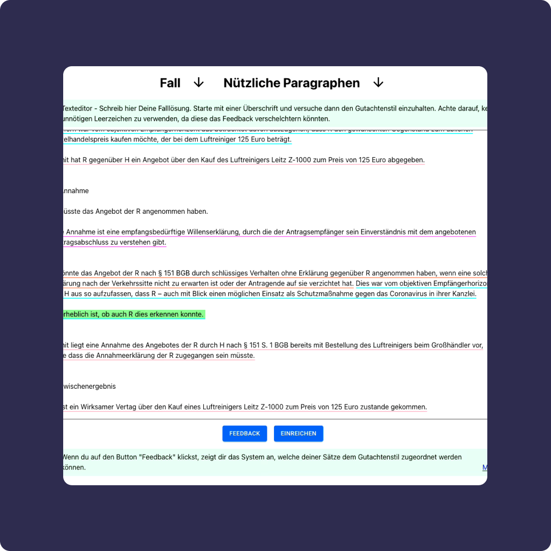 “Es hat auf jeden Fall dabei geholfen, eine gewisse Struktur zu bewahren und nichts zu vergessen, da das Feedback beispielsweise darauf hingewiesen hat, dass auf den Obersatz nicht vollständig geantwortet wird und ich damit mein Gutachten verbessern konnte”