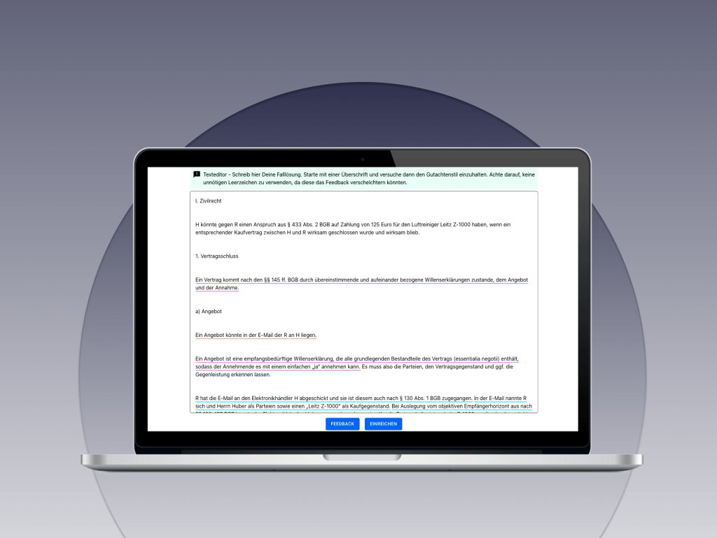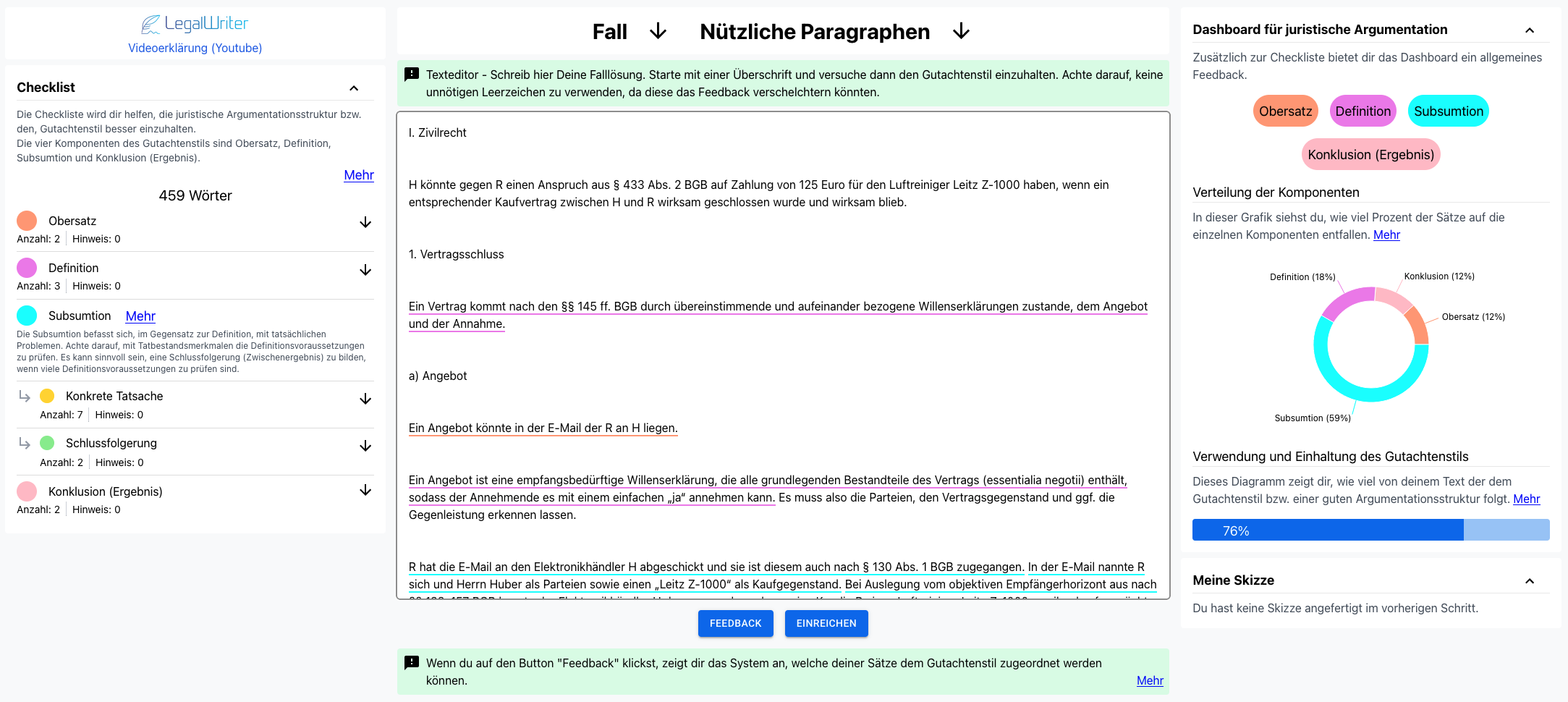 Der Texteditor des Systems hebt hervor, welche Komponenten des Gutachtenstils verwendet wurden, wodurch die Lernenden ihre erfolgreichen Umsetzungen sehen können, während unmarkierte Sätze Bereiche zur Verbesserung anzeigen.