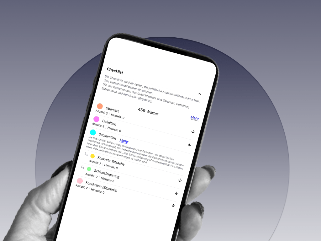 Lernende verwenden eine umfassende Checkliste innerhalb des Systems, um sich durch die wichtigsten Aspekte des Gutachtenstils leiten zu lassen und die Textqualität zu verbessern.